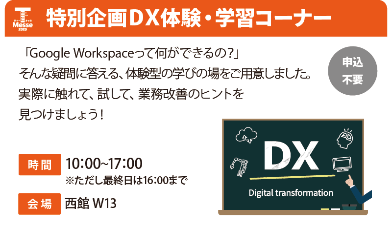 「Google Workspaceって何ができるの?」そんな疑問に答える、体験型の学びの場をご用意しました。実際に触れて、試して、業務改善のヒントを見つけましょう!