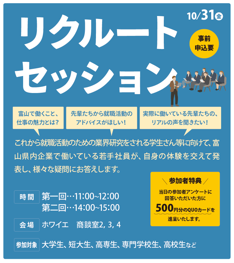 これから就職活動のための業界研究をされる学生さん等に向けて、 富山県内企業で働いている若手社員が、自身の体験を交えて発表し、様々な疑問にお答えします。