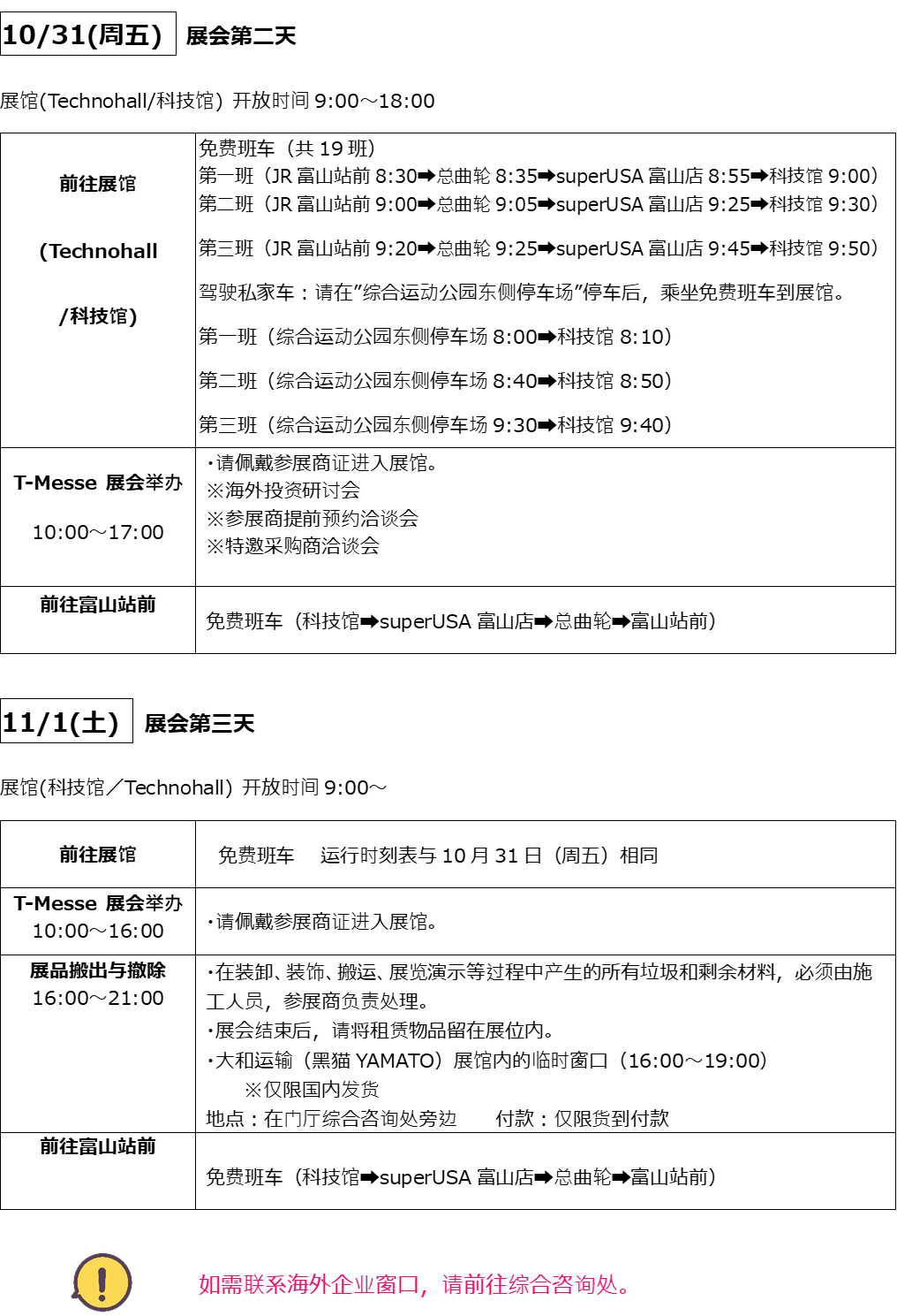 T-Messe2025事务局为参展商与参观者,安排了往返于富山车站和展馆间的免费班车。